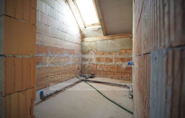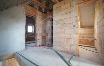Emelet: 2 szoba (lehetőség van 3 szoba kialakítására), 1 nagyobb fürdő épített zuhanyfülkével, 1 mosókonyha, 1 közlekedő