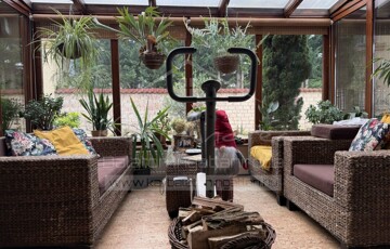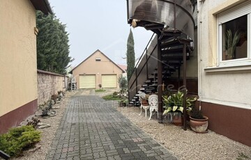 Az udvarban található egy 80 m²-es, különálló gazdasági épület, amely 3 autó számára alkalmas garázsként funkcionál, elektromos autó töltési lehetőséggel, valamint további tárolóhelyiséggel.